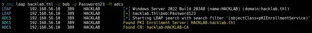 nxc ldap hacklab.thl -u bob -p Password123 -M adcsPara empezar, podemos identificar vulnerabilidades de AD CS usando certipy-ad con las opciones find y -vulnerable.