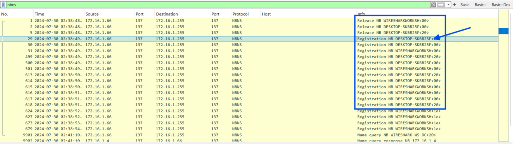 Los paquetes NBNS (NetBIOS Name Service) revelan nombres de host en redes Windows.