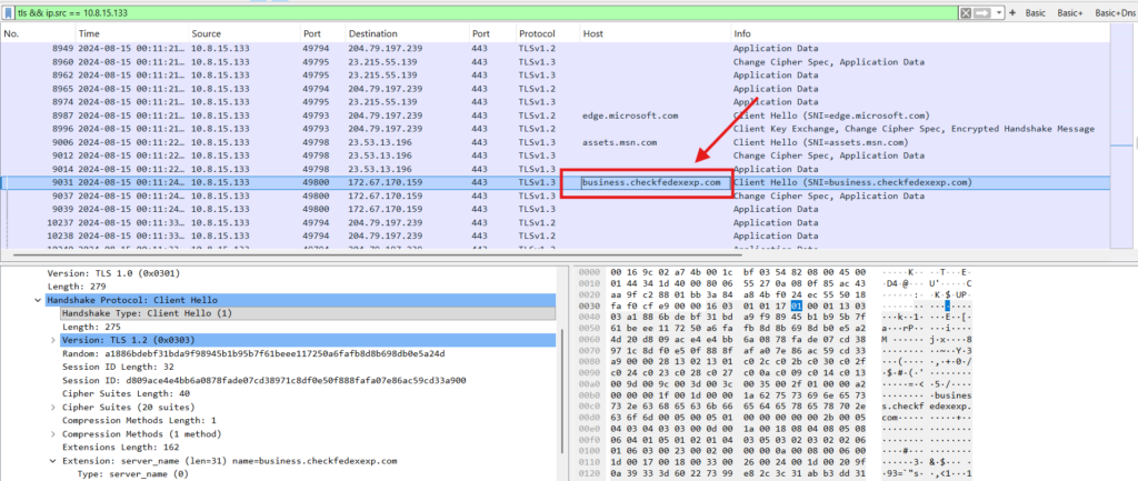 Muestra exclusivamente tráfico TLS generado por la víctima.